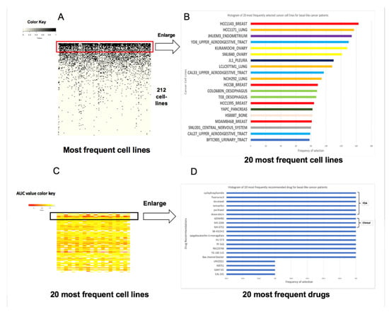 The most frequently occurring cancer cells and recommended drugs to 156 basal like patients with breast cancer. (A) The distribution of the different cell lines selected by our method for patients with basal like breast cancer. The X-axis contains the different patients while the Y-axis consists of the different cancer cell lines. The cell lines were sorted based on the frequency of their selection in descending order. (B) An enlargement of the top 20 cancer cell lines with the highest frequency. (C) A heatmap distribution of the drugs for basal like cancer patients based on area under the curve (AUC) values. The X-axis is the cancer cell lines that are selected from these patients and the Y-axis is the different recommended drugs. (D) A frequency depiction of the top 20 recommended drugs to these patients.