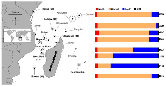 - Bourjea, J.; Mortimer, J.A.; Garnier, J.; Okemwa, G.; Godley, B.; Hughes, G.; Dalleau, M.; Jean, C.; Ciccione, S.; Muths, D. Population structure enhances perspectives on regional management of the western Indian Ocean green turtle. Conserv. Genet. 2015, 16, 1069–1083. [Google Scholar] [CrossRef]