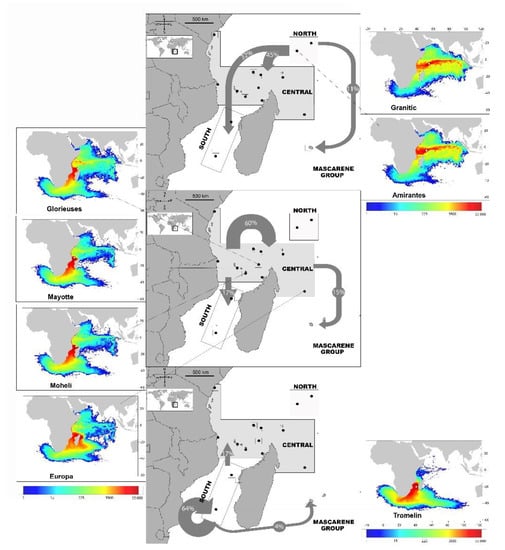 For large pelagic fishes that show cosmopolitan distribution, large population size, high fecundity, the production of numerous pelagic larvae, and the ability to easily migrate across an entire ocean, no structuring at the scale of the SWIO, or even at the scale of the Indian Ocean, was found (e.g., bigeye tuna [79] and swordfish [80]). Although characteristics of the sea turtle life cycles prevent direct comparison with fish or more general marine species models, several studies of coastal marine species have shown a number of patterns for different taxa, emphasizing the complexity of connectivity patterns, and its dependence on many factors, including life history traits and physical oceanography [81].