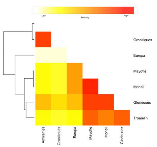 Schematic heatmap of pairwise similarity between drifting trajectories patterns of modeled particles from seven green turtle rookeries of the South West Indian Ocean. Light yellow/Intense red represents low/high similarity between drifting patterns. Drifting patterns similarities were computed as the opposite of the Euclidean distance between drifting density matrices.