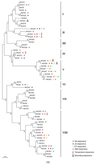 One interesting observation is that very closely related genes (e.g., NtVQ33/NtVQ34 in II group, NtVQ46/NtVQ58 and NtVQ48/NtVQ52 in Group V, and NtVQ35/NtVQ39 and NtVQ20/NtVQ23 in Group VIII) all appeared to be similarly regulated (also summarized in Figure 1). This likely reflects the fact that they are paired genes from different progenitor backgrounds that are involved in similar developmental or stress responsive regulatory pathways.