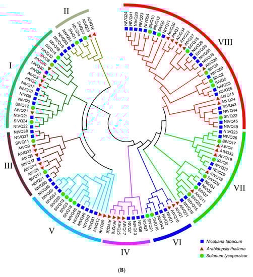 Using available genomic sequences for N. tabacum (cultivated tobacco) in the NCBI database, we were able to data mine a total of 59 NtVQ proteins using HMMER software. Based on the homology of the NtVQ proteins to orthologs in the Pfam database, we designated these proteins as NtVQ1 to NtVQ59. To explore the evolutionary relationship of the 59 NtVQ proteins, a phylogenic tree of the 59 NtVQ proteins was constructed using the Maximum Likelihood Method in Mega 7.0 (Figure 1A). In addition, a phylogenic tree was built using the 59 NtVQ protein sequences and those of 34 and 26 VQ motif-containing proteins of Arabidopsis and tomato, respectively (Figure 1B). Phylogenetic analysis of the NtVQ proteins based upon their nucleotide sequence, gene structure (exon–intron organization) and organization of conserved protein domains showed that the tobacco NtVQ proteins cluster into eight main groups (Figure 1A). When compared with the VQ proteins across species, the NtVQ clustering pattern and clades in our analysis (Figure 1B) exhibited high similarities to those previously reported in Arabidopsis and tomato with only minor differences [11,24]. For example, the Arabidopsis AtVQ2 alone was clustered in one branch, while in our analysis it was clustered with AtVQ3. Moreover, the evolutionary relationship indicated that the NtVQ proteins have a close affinity with the tomato VQ proteins and have a relatively slight distant affinity with the Arabidopsis VQ proteins in the same group, since AtVQ31 was located in one branch alone. This is likely because both tomato and tobacco belong to the Solanaceae family while Arabidopsis belongs to the family of Cruciferae. Cultivated tobacco (N. tabacum) originated from N. tomentosiformis and N. sylvestris. Not surprisingly, results of BLAST analysis showed that the NtVQ genes overwhelmingly appear in pairs in the phylogenic tree with an almost evenly derived distribution from the two progenitors (i.e., 29 NtVQ genes from N. tomentosiformis and 29 from N. sylvestris) (Supplementary Table S2), with the only exception being NtVQ40. As discussed below, homologous genes also appear to display similar responses to both biotic and abiotic stimuli.