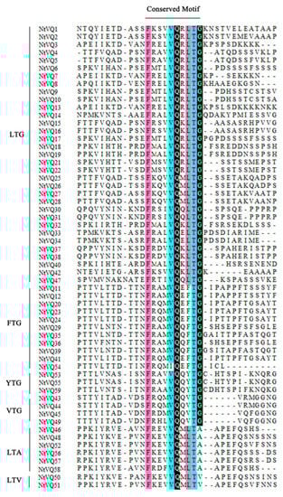 Multiple sequence alignment of the VQ motif based on their entire VQ protein length for the VQ proteins in tobacco. Multiple sequence alignment of the VQ motif for 59 NtVQ proteins showing the highly conserved FxxxVQxLTG motif, which can be further divided into several subgroups such as LTG, FTG, YTG, etc., based on the last three amino acids.