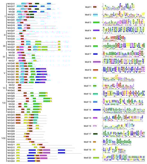 To better understand the structural diversity of NtVQ proteins, MEME analysis was performed and a total of 20 different motifs (ranging from 15 to 50 aa in length) were identified (Figure 3). Apart from the expected conserved VQ motif found in all NtVQ proteins, each Group (I-VIII) generally contained a clearly identifiable motif structure that distinguished it from other groups. Some contained only one conserved motif and others as many as seven. For example, the Group II and VI members only contained the VQ motif, whereas two members of Group III had seven different motifs. Motif 4 was only present in Group V and motif 14 only in Group VIII. In general, VQ protein sequences belonging to the same subgroup tended to contain basically the same type of motifs (Figure 3).