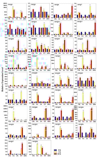 Expression analysis of significantly modulated NtVQ genes in response to different phytohormones. Two-week-old seedlings were treated with 2 mM SA, 100 μM JA, 1 mM ET, or 100 μM ABA for 0, 3, and 24 h before the whole seedlings were harvested for RNA isolation and qRT-PCR. The relative expression value of each NtVQ gene was normalized to NtEF1α with CK at 0 h as calibrator. CK, control group treated with 0.1% DMSO. * indicates the level of significance relative to the CK value (* p < 0.05, ** p < 0.01).
