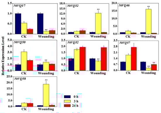 Expression analysis of significantly modulated NtVQ genes in response to mechanical wounding. Two-week-old seedlings were treated with wounding for 0, 3 and 24 h, respectively, before collected for RNA isolation and qRT-PCR. The relative expression value of each NtVQ gene was normalized to NtEF1α with CK at 0 h as calibrator. CK, control group without wounding. * indicates the level of significance relative to the CK value (* p < 0.05, ** p < 0.01).