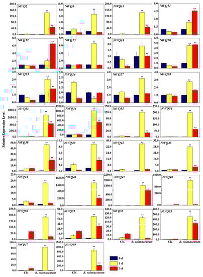 Expression analysis of significantly modulated NtVQ genes in response to challenge by Ralstonia solanacearum. Four-week-old seedlings were inoculated with 50 μL bacteria (OD = 0.001) for 0, 1 and 3 d before the leaf tissues were harvested for RNA extraction. The relative expression value of each NtVQ gene was normalized to NtEF1α with CK at 0 h as calibrator. CK, control group inoculated with 10 mM MgCl2. * indicates the level of significance relative to the CK value (* p < 0.05, ** p < 0.01).