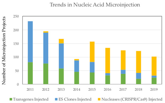 The efficiencies of producing specific double-strand chromosome breaks, using prior technologies such as meganucleases, ZFNs, and TALENs [,,], were surpassed when CRISPR/Cas9 technology was shown to be effective in mammalian cells [,,]. The essential feature that all of these technologies have in common is the production of a chromosome break at a specific location to facilitate genetic modifications []. In particular, the discovery of bacterial CRISPR-mediated adaptive immunity, and its application to genetic modification of human and mouse cells in 2013 [,,], was a watershed event to modern science. Moreover, the introduction of CRISPR/Cas9 methodology has revolutionized transgenic mouse generation. This paradigm shift can be seen by changes in demand for nucleic acid microinjections into zygotes, and ES cell microinjections into blastocysts at the University of Michigan Transgenic Core (Figure 1). While previously established principles of genetic engineering using mouse ES cell technology [,,] remain applicable, CRISPR/Cas9 methodologies have made it much easier to produce genetically engineered model organisms in mice, rats, and other species [,]. Herein, we discuss principles in genetic engineering for the design and characterization of targeted alleles in mouse and rat zygotes, or in cultured cell lines, for the production of animal and cell culture models for biomedical research.