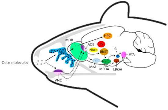 - Scalia, F.; Winans, S.S. The differential projections of the olfactory bulb and accessory olfactory bulb in mammals. J. Comp. Neurol. 1975, 161, 31–56. [Google Scholar] [CrossRef]