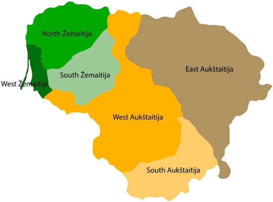 The contemporary Lithuanian population, the subject of this study, occupies a north-eastern European region and it is a complex mixture of the former Baltic tribes speaking the most archaic Indo-European language []. The first settlement in the contemporary Lithuanian territory from the late Paleolithic period after the last glaciation was found in west Lithuania along the Baltic Sea, dated around 11,000 years before present []. These people were hunter-gatherers from Central and Western Europe. According to Gimbutas (1963), the first Baltic Costal culture in the territory of Lithuania was formed through the interaction of Indo-Europeans and autochthonous populations in the late Neolithic []. Consolidation of the Baltic tribes contributed to the formation of the present day Lithuanian dialects and regional linguistic differentiation in Lithuania. Six ethnolinguistic regions are distinguished in Lithuania: three regions of Aukštaitija (western, southern, and eastern) and three regions of Žemaitija (northern, western, and southern) (Figure 1).