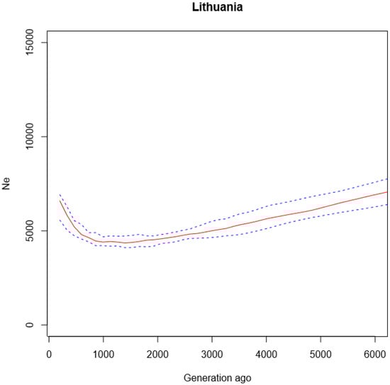 The present study illuminated the demographic history of the Lithuanian population. The Ne changed through time for the Lithuanian population, showing the substantial reduction in Ne over the 150,000–25,000 YBP period and a subsequent re-expansion. At a similar time of about 25,000 years ago, a growth in a population size was observed in non-African populations, especially Europeans and Asians. The estimated long-term Ne of the Lithuanian population is quite low—5404—as in many other Northern populations. For example, the Ne of Finland is 5200. This is likely a consequence of the bottlenecks associated with the last glacial period in 25,000–12,000 YBP in Europe [,].