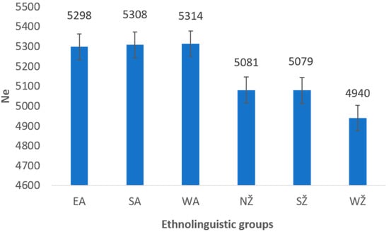 The estimated harmonic Ne for each ethnolinguistic region ranged from 4940 (CI 4674–5304) in the West Žemaitija (WŽ) group to 5314 (CI 4829–5490) in the West Aukštaitija (WA) group (Figure 4). The difference in the estimated long-term Ne values between the two main ethnolinguistic groups (Žemaitija and Aukštaitija) of Lithuania was statistically significant (p < α, α = 0.001, Wilcoxon–Mann–Whitney test).