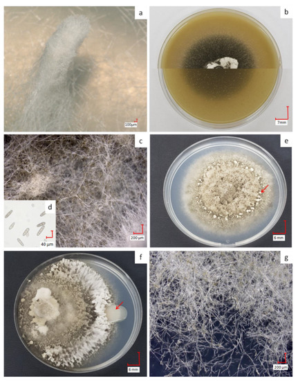 Phenotypes of D. teres on malt extract agar (MP) (−) with the typical feather duster (a); aspect of D. teres on BOA (+) with top and bottom views of the Petri dish in the two halves of the image (b); mycelium of D. teres on BOA (+) (c); transversely septate conidia produced by D. teres on BOA (+) (d) and D. teres phenotype on PDA (+/−) medium with fruiting bodies (red arrow in e), aspect in the presence of PsJN (f) and mycelium on PDA (+/−) (g). The co-culture condition shows that PsJN (red arrow in f) has no visible effect on the mycelium’s growth on PDA (+/−) medium. The pictures (a,c,d,g) were obtained with a 3D Keyence VHX-2000F microscope.