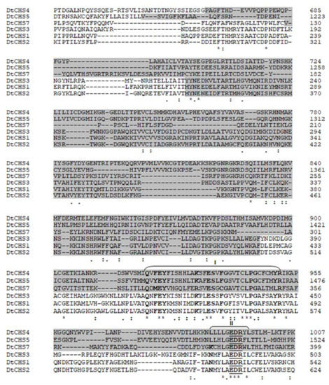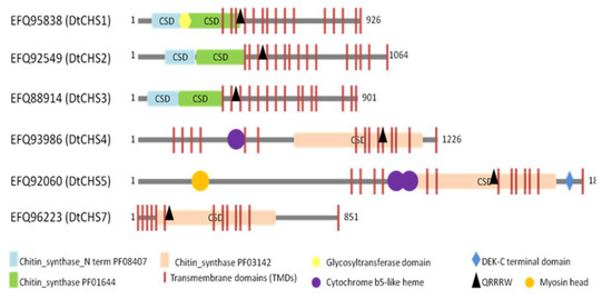 According to the classification proposed by Chigira et al. [55] and Choquer et al. [56], in our study, DtCHS1, DtCHS2, DtCHS3, DtCHS4, DtCHS5 and DtCHS7 encode CHSs from Class I, Class II, Class III, Class IV, Class V and Class VII, respectively [55,56]. These enzymes are localized in the plasma membrane [9].