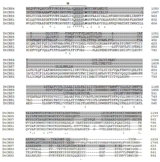 Partial amino acid sequence alignment of the six D. teres CHSs showing the conserved chitin synthase domain (highlighted) and “QRRRW”/“EDR” motifs (underlined). Amino acids indicated with bold characters are those conserved in all CHSs listed here. I-III represent subdomains where conserved amino acids appear at high frequencies.