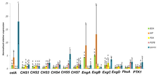 Normalized relative expression of cell wall genes of D. teres cultivated on different media. Different letters indicate statistically different values (p-value < 0.05) among the groups of the one-way ANOVA with Tukey’s post-hoc test. Error bars represent the standard deviation of four independent biological replicates.