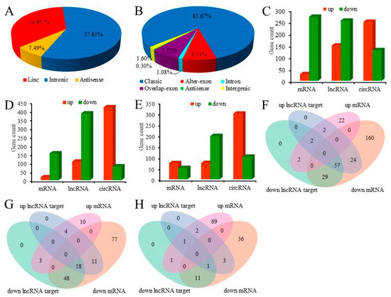 Gene expression characterization. (A) The type and proportion of lncRNAs. (B) The percentage of six types of circRNAs. (C) Histogram representing the numbers of upregulated and downregulated mRNAs and ncRNAs in sheep uteri between the short photoperiod (SP) and long photoperiod (LP) groups. (D) Histogram representing the numbers of upregulated and downregulated mRNAs and ncRNAs in sheep uteri between the SP and short transfer to long photoperiod (SLP) groups. (E) Histogram representing the numbers of upregulated and downregulated mRNAs and ncRNAs in sheep uteri between the LP and SLP groups. (F) Venn diagram representing the overlapping numbers of upregulated lncRNA-targeted mRNAs, downregulated lncRNA-targeted mRNAs, upregulated mRNAs, and downregulated mRNAs between the SP and LP groups. (G) Venn diagram representing the overlapping numbers of upregulated lncRNA-targeted mRNAs, downregulated lncRNA-targeted mRNAs, upregulated mRNAs, and downregulated mRNAs between the SP and SLP groups. (H) Venn diagram representing the overlapping numbers of upregulated lncRNA-targeted mRNAs, downregulated lncRNA-targeted mRNAs, upregulated mRNAs, and downregulated mRNAs between the LP and SLP groups.
