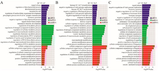 GO analyses of differentially expressed mRNAs, lncRNA targets, and circRNA host genes. (A) The top 10 enrichment biological processes for differentially expressed mRNAs, lncRNA targets, and circRNA host genes are listed between the SP and LP groups. (B) The top 10 enrichment biological processes for differentially expressed mRNAs, lncRNA targets, and circRNA host genes are listed between the SP and SLP groups. (C) The top 10 enrichment biological processes for differentially expressed mRNAs, lncRNAs target, and circRNA host genes are listed between the LP and SLP groups.