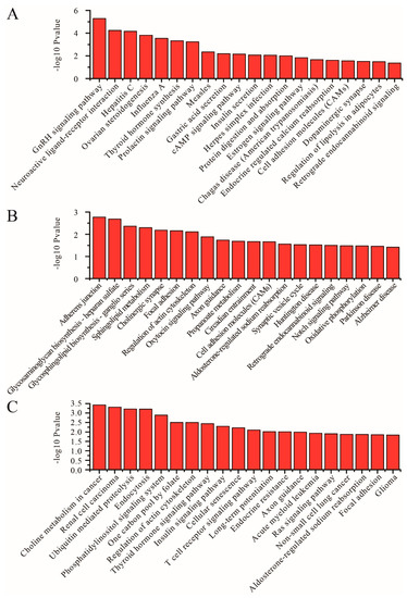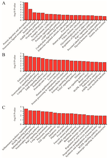 KEGG is a primary public pathway database. The graphic exhibition of KEGG enrichment analysis represents the augmented scatter diagram of the selected target genes. The top 20 pathways are shown in Figure 3, Figure 4 and Figure 5. Between SP and LP, the DE mRNAs were enriched in protein digestion and absorption, insulin secretion, GnRH signaling pathway, ovarian steroidogenesis, thyroid hormone synthesis, prolactin signaling pathway, cAMP signaling pathway, carbohydrate digestion and absorption, and thyroid hormone signaling pathway (Figure 3A, Table S20). With regard to differentially expressed lncRNAs, targeted mRNAs were associated with pathways such as the estrogen signaling pathway and the VEGF signaling pathway (Figure 3B, Table S21). With regard to differentially expressed circRNA, host genes were associated with pathways such as GnRH signaling pathway and starch and sucrose metabolism (Figure 3C, Table S22).