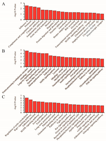 KEGG analyses of differentially expressed genes between the SP and LP groups. (A) The top 20 KEGG enrichment pathways for differentially expressed mRNAs between the SP and LP groups. (B) The top 20 KEGG enrichment pathways for differentially expressed lncRNA target genes between the SP and LP groups. (C) The top 20 KEGG enrichment pathways for differentially expressed circRNA host genes between the SP and LP groups.