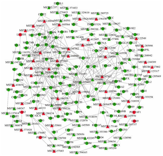 Construction of the lncRNA–mRNA co-expression network between the SP and LP groups. Red and green represent upregulated and downregulated, respectively. Octagons and triangles represent mRNAs and lncRNAs, respectively.