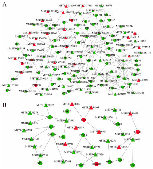 Construction of the lncRNA–mRNA co-expression network. (A) Construction of the lncRNA–mRNA co-expression network between the SP and SLP groups. (B) Construction of the lncRNA–mRNA co-expression network between the LP and SLP groups. Red and green represent upregulated and downregulated, respectively. Octagons and triangles represent mRNAs and lncRNAs, respectively.