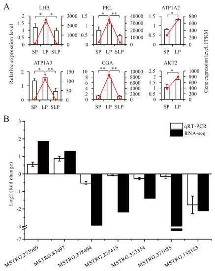 A total of thirteen genes, including six mRNAs (LHB, PRL, ATP1A2, ATP1A3, CGA, and AKT2) related to reproduction and seven random lncRNAs (MSTRG.273909, MSTRG.87497, MSTRG.378494, MSTRG.229415, MSTRG.353354, MSTRG.371055, and MSTRG.138183), were selected for qRT-PCR verification. The qRT-PCR analysis showed that the expression trends in the genes were similar to the trends in the RNA-seq results, supporting the credibility of the transcriptomics data (Figure 8A,B).