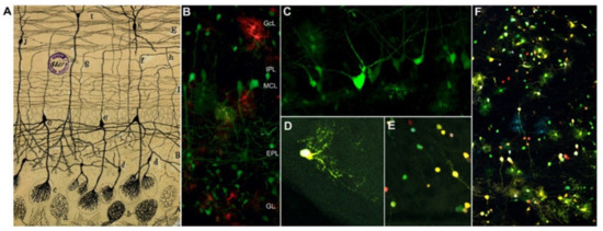 The mammalian olfactory system is composed of the olfactory epithelium (OE), olfactory bulb (OB), and olfactory cortex (OC). The rodent OB is organized into six layers that contain distinct cell populations and that are essentially made up of two types of neurons, interneurons, and projection/output neurons [1,2]. Using the Golgi method, Santiago Ramón y Cajal described the layers in the OB and its components more than a century ago (Figure 1A reproduces an original drawing of Cajal [3]; reviewed in [4]). His morphological studies on the OB provided the basis to define the neurons present in this structure and when UbC-StarTrack strategy is compared, the cells labeled in the adult OB following in utero electroporation (IUE) are similar to those drawn by Cajal (Figure 1A–F). Mitral cells (Figure 1(Ae),C) are the first cell type to be born in the rodent OB, between E10 and E13, and with a neurogenic peak around E11 [5]. The axonal projections of mitral cells form the lateral olfactory tract (LOT) and they establish direct contacts with the OC [6,7].