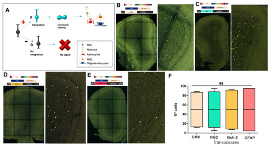 Diagram of the UbC-StarTrack strategy based on transposase promoter expression (A). The concept that is focused in the transposase only integrates copies of the UbC-StarTrack vectors into progenitor cells with the corresponding promoter active, labeling all their progeny (a). Progenitor cells with the inactive promoter do not integrate copies into the NSCs (b). For these experiments, the CMV, NG2, Gsh-2, and GFAP promoters were chosen to target specific NSCs. The first strategy with CMV-hyPBase labeled OB interneurons in the different layers (B). The NG2 progeny labeled cells in the GcL and GL (C), resembling the Gsh-2 progeny (D). GFAP progenitors gave rise to granular cells and periglomerular cells (E). GFAP progenitors produced fewer labeled cells in the OB than the other vectors (F). All data were normalized; the box plot represents the percentage of labeled cells after targeting each set of progenitors with a specific transposase (whiskers represent 5th/95th percentile, horizontal line displays the median of the data; n = 3 for each transposase). Data showed no statistically significant difference between groups (ns). CMV-progenitors are shown in soft pink; NG2-progenitors in blue; Gsh-2 in yellow; GFAP-progenitors in red.