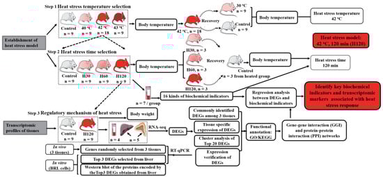Experimental design of the study. First, heat stress (HS) conditions were explored by analyzing the body temperature of rats at different high ambient temperatures or treatment times, as well as body temperature recovery after transferring to 30 °C or 22 ± 1 °C from HS conditions (Steps 1 and 2). After 42 °C HS for 30 min (H30), 60 min (H60), and 120 min (H120), animals were euthanized, and their blood biochemical indicators were measured (Step 2). RNA-sequencing was used to establish the transcriptomic profiles of blood (n = 4), liver (n = 5), and adrenal gland (n = 5) tissues of rats in H120 and control groups (Step 3). Differentially expressed genes (DEGs) analysis, its validation, gene ontology terms (GO), and Kyoto Encyclopedia of Genes and Genomes (KEGG) pathway analysis, and gene–gene and protein–protein interaction network (GGI and PPI) construction were conducted to characterize the common and specific DEGs responses to HS in blood, liver, and adrenal glands. Finally, the Pearson correlation analysis of the DEGs in three tissues and the biochemical indicators in blood was performed.