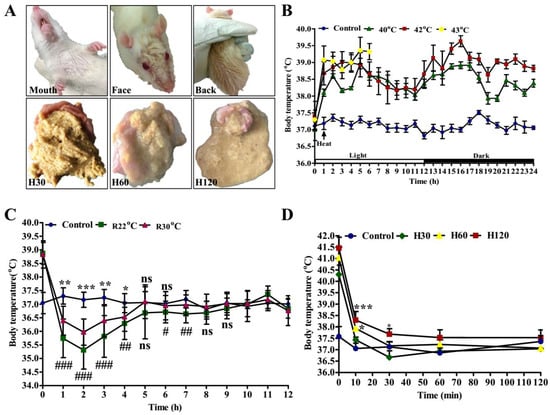 Behavior and physiological changes after heat stress (HS). (A) The behavior of rats at 42 °C HS. Figure 1A displays the sweating of rats and the state of their gastric content with prolonged HS time, sorted according to the order of sweating sites; (B) the body temperature of rats exposed to control (22 ± 1 °C) (n = 9), 40 °C (n = 9), and 42 °C (n = 18) conditions. The number 0 on x-axis means rats were at the control condition and 1-24 means 24 h, from 06:00 a.m. to 05:00 a.m. the next day; (C) body temperature recovery monitoring of the H120 group at ambient temperatures of 30 °C (R30 °C, n = 9) and control (R22 °C, n = 9). * and # represent the significant extent of R30 °C and R22 °C group temperature changes in comparison with the control, respectively. (D) The body temperature recovery of the rats in H30, H60 and H120 groups at 22 ± 1 °C, compared with control. n = 3 per group. Data is represented as mean ± standard deviation. The ns means p ≥ 0.05, *and # p < 0.05, ** and ## p < 0.01, *** and ### p < 0.001 (Student’s t-test).
