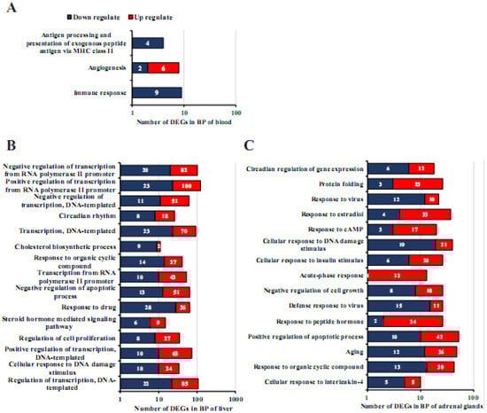 Significantly enriched biological process (BP) terms of blood, liver, and adrenal gland tissues in H120 vs. Control groups. (A, B and C) The top 15 significantly enriched BP terms identified in blood, liver, and adrenal gland tissues. The number of upregulated (red) and downregulated (blue) DEGs (q < 0.05 and absolute log2 (fold-change) > 1) enriched BPs in blood, liver, and adrenal glands when H120 was compared to control groups. The x-axis coordinates are represented on a logarithmic scale with a radius of 10. The BP terms (up to down) were sorted by q values from small to large.