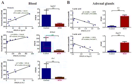 Regression analysis of the significantly DEGs (x-axis) with the biochemical indicator levels of blood (y-axis). (A) The regression analysis of the expression levels of S100a6, Fn1, and Lgals3 in blood with the biochemical indicator levels (n = 4 per group); (B) the regression analysis of the expression levels of F2 and Kng1l1 in the adrenal glands with the biochemical indicator levels (n = 5 per group). p < 0.05 means significant regression. ** represents p < 0.01.