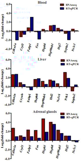 In order to verify the accuracy of RNA-seq data, nine genes were selected for RT-qPCR validation in blood, liver, and adrenal glands (Figure 8). Our results showed the expression patterns of these genes generated from RNA-seq were consistent with the results of RT-qPCR. The Pearson correlation of the genes in blood, liver, and adrenal glands between RNA-seq analysis and RT-qPCR were 0.89, 0.91, and 0.89 (p < 0.01), respectively.