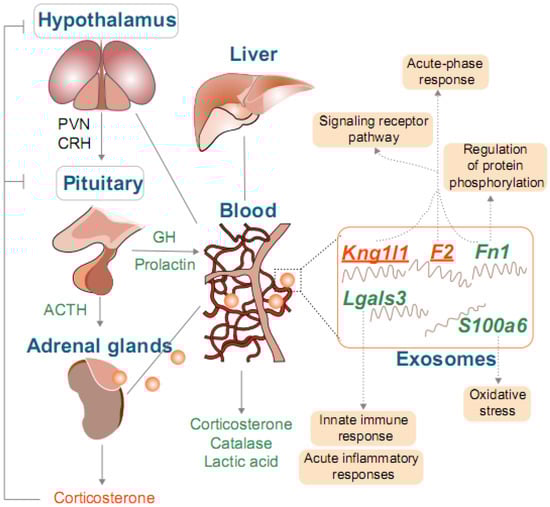 Genes identified in blood including, Lgals3, S100a6, and Fn1, and in the adrenal glands, F2 and Kng1l1, were identified as candidate genes in the composition of exosomes for HS response. These genes play a central role in immunity and oxidative stress as summarized in Figure 10.