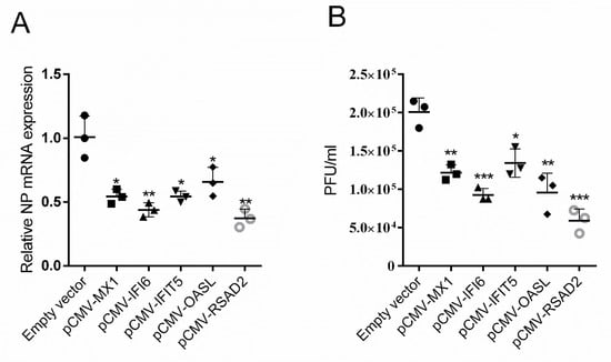 Chicken MX1, IFI6, IFIT5, RSAD2, and OASL significantly inhibited H5N6 virus infection. DF1 cells in 12-well plates were transfected with 1 μg empty vector, MX1, IFI6, IFIT5, RSAD2, and OASL expression vector. After 24 h, cells were infected with 1 MOI H5N6 virus. After 24 hpi, the cells were lysed for RNA extraction, and the supernatants were collected for the viral titers. The mRNA of viral NP was determined by qRT-PCR (A), and the viral titer was determined by plaque assay (B). The values are shown as the mean and SD and are representative of three independent experiments. Data were analyzed using Student’s t test. ***, p < 0.001; **, p < 0.01; *, p < 0.05.