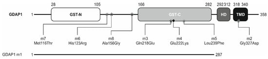 Schematic representation of the GDAP1 domain structure. Studied protein changes are indicated. GDAP1 m1 is a truncated version of GDAP1, lacking the domains responsible for correct localization of the protein (HD and TMD). Dominant mutations leading to the given substitution are flagged by stars (*) and recessive instances by a hashtag (#). GDAP1 m4, which may be inherited in both dominant and recessive ways, is indicated by dot (•). Domains (based on Pfam database): (GST) glutathione S-transferase domain; (HD) hydrophobic domain; (TMD) transmembrane domain.