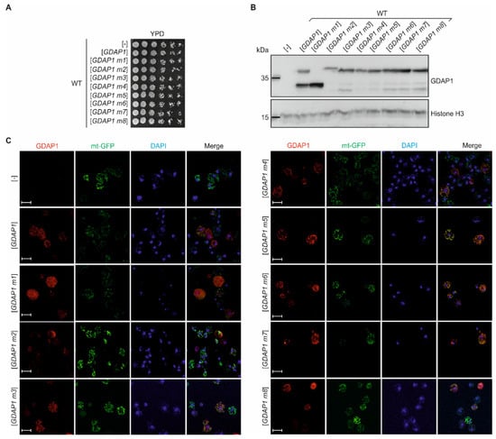 GDAP1 protein was been characterized as being localized to the mitochondrial membrane in neuronal cells [,,]. Thus, in order to further characterize human GDAP1 functionality in the heterologous yeast-based system, we analyzed its cellular localization by confocal microscopy. The yeast cells were transformed with a plasmid encoding a mitochondrially targeted green fluorescence protein (mt-GFP) [], empty vector or a series of GDAP1 variants either with or without mutations. The wild-type GDAP1 protein was located in structures that matched the location of mt-GFP. Similarly, m3, m4, m5, m6 and m7 mutations did not result in changes in the subcellular localization of these GDAP1 protein variants. Two mutations, namely m1 and m2 (causing a C-terminal deletion and the Gly327Asp substitution, respectively), resulted in GDAP1 proteins that did not localize to mitochondria (Figure 2C and Figure A1). However, the level of fluorescence signal from the GDAP1 m2 protein was only slightly higher than the background signal observed for the empty vector control making it very difficult to observe the protein. The mislocalization of the GDAP1 m1 and m2 protein variants is most probably the result of an absence (in the case of GDAP1 m1) or functional impairment (for GDAP1 m2) of the transmembrane domain (TMD), which has previously been shown to be responsible for the mitochondrial membrane anchoring of GDAP1. Similarly to previous observations made in COS7 cells, mutations that resulted in changes within the TMD (e.g. GDAP1 m2) of the GDAP1 protein impaired the targeting of GDAP1 to the mitochondrial membrane [].