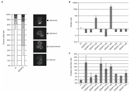 In previous studies, GDAP1 has been shown to alter the formation of mitochondrial networks when expressed in HeLa cells []. In our study we investigated whether expression of GDAP1 in the heterologous system also changes the morphology of mitochondrial networks, especially given that the human protein is also localized to the mitochondria. The mitochondria were visualized by expression of mt-GFP. The network of mitochondria of cells transformed with empty vector were used as a reference. As expected, mitochondria formed tubular network structures below the cell cortex. After the introduction of cDNA encoding human GDAP1 protein, we observed an alteration of the mitochondrial network. We named this a supernetwork due to the more extensive and branched nature of the network (Figure 3A). Compared to the wild–type yeast, about 50% of the counted GDAP1 transformed cells displayed this supernetwork phenotype. We also observed spherical and abnormal phenotypes, but there were no marked differences in the number of cells with such mitochondria between the cells expressing the cDNA of wild-type GDAP1 and those that were not (Figure 3A).