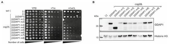3.6. The Expression of Human Wild-Type GDAP1 Gene Reduces the Growth Defect of the csg2 Mutant Yeast Strain