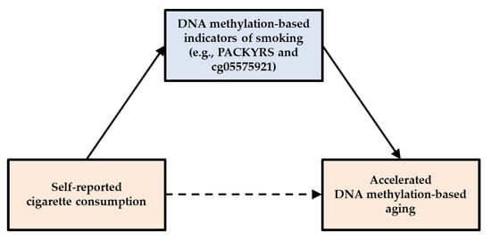 Theoretical model linking self-reported cigarette consumption to accelerated aging outcomes through DNA methylation-based indicators of smoking.