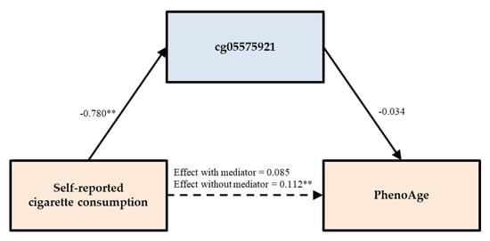 cg05575921 reduces the direct effect of self-reported cigarette consumption on PhenoAge to non-significance. Note. Chi-square = 41.539, df = 7, p = 0.000; CFI = 0.944; SRMR = 0.041. Values are standardized parameter estimates. ** p ≤ 0.01; * p ≤ 0.05 (two-tailed tests).