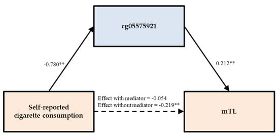 To further examine the indirect effects of self-reported cigarette consumption on DNA methylation-based outcomes through either PACKYRS or cg05575921, we used bootstrapping methods with 1000 replications. As can be seen in Table 3, the tests for indirect effects of self-reported cigarette consumption on PhenoAge through either PACKYRS or cg05575921 was not significant. The test of the indirect effect of self-reported cigarette consumption on mTL through PACKYRS was significant, indirect effect (IE) = −0.126, 95% CI [−0.224, −0.023], accounting for 57.534% of the total effect. Likewise, using bootstrapping methods with 1000 replications, the test of the indirect effect of self-reported cigarette consumption on mTL length through cg05575921 was significant, indirect effect (IE) = −0.166, 95% CI [−0.264, −0.065], accounting for 75.455% of the total effect. To better illustrate the way in which direct and indirect effects were related, we plotted the mediational model for mTL through cg05575921 in Figure 2.