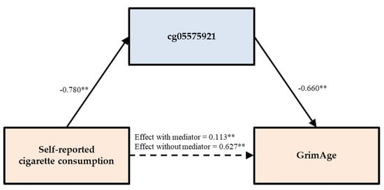 To illustrate the way in which direct and indirect effects were related for mTL and for GrimAge, in Figure 3 (mTL) and Figure 4 (GrimAge) we plotted mediational models using cg05575921 as the mediator. As can be seen, the introduction of the mediator substantially reduces the direct effect, and in each case there is a significant association of self-reported with DNA methylation-based assessment of smoking, which in turn is significantly associated with the outcome, resulting in the observed significant indirect effect through the mediator.