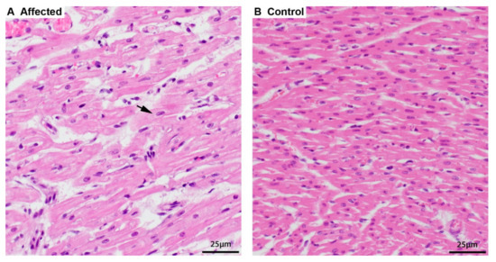 Histopathology of the heart. (A) Cardiomyocytes of an affected puppy are swollen and pale, and the sarcoplasm around the nucleus is dispersed (arrow) by finely granular material, hematoxylin and eosin (HE) stain. (B) Normal, smaller, and more intense staining of cardiomyocytes of a 5-week-old control puppy, HE stain.