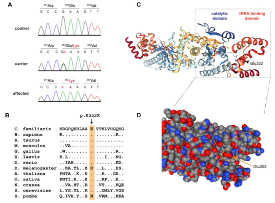 Details of the YARS2:p.Glu352Lys variant. (A) Representative Sanger electropherograms of a control, a carrier, and an affected dog illustrate the c.1054G>A variant. The amino acid translations are shown. (B) Evolutionary conservation. The glutamate at position 352 is highly conserved across all eukaryotes. (C) Three-dimensional structure of the human YARS2 protein in complex with an adenylate homolog [16,17,18]. The position of Glu352 is indicated in the right monomer. (D) Enlarged details of the structure in a space-filling model. The negatively charged carboxyl group of Glu352 is located at the surface of the tRNA binding domain.