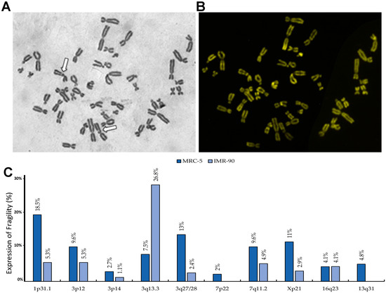 Cytogenetic localization and expression of common fragile sites in fibroblast cell lines. (A) IMR-90 metaphase stained with Giemsa. The white arrow shows the break on chromosomes 3 (3q13.3). (B) The same sample stained with CMA3 for more precise localization by banding. (C) The histogram showing the percentage of breaks expressed in both MRC-5 and IMR-90 cell lines as an average of three experiments; the breaks with frequency lower than 3% were not considered, given their uncommon fragility.