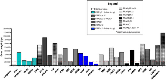 Genes contained within CFSs were found to be longer than the average human gene. Genomic locations of all CFSs experimentally characterized in fibroblasts were defined and all genes mapping to the CFS regions were identified. The gene length is plotted. The plotted average human gene length (first bar) was derived by dividing the sum of the length of all annotated human genes divided by the total gene number. The red line indicates a previously reported > 300 kb cut off for long genes associated with CFSs [13].
