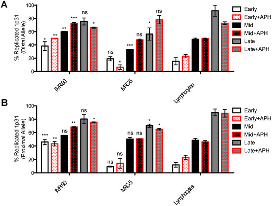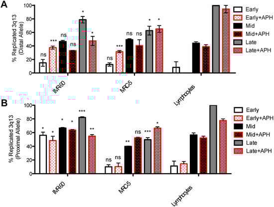To identify replicating interphase nuclei, 10 μM of bromodeoxyuridine was added to the culture medium 20 min prior harvesting the cells. The same slides treated with FISH probes were washed once with 4 × SSC 0.1% Tween20 (Sigma-Aldrich) solution, followed by 2 hours of incubation with primary antibody anti-bromodeoxyuridine (BrdU) (1:1000, Thermo-Fisher). After three washes in PBS 1X (Phosphate Buffered Saline 1X), the secondary antibody FITC-anti-mouse IgG (Immunoglobulin G) (1:100, Thermo-Fisher) was added for 1 hour. The slides were washed four times in PBS 1× and mounted with Vectashield H-1200 with DAPI (Vector Laboratories, Burlingame, CA). The slides were stored at 4 °C overnight before observation on a fluorescent Zeiss Axioplan microscope equipped with CCD. The quantification shown in the histograms (Figures 5 and 6) display the mean and the standard error of the mean (SEM) from three independent experiments with more than 30 nuclei in each stage (early, mid-, late-S-phase). The p-value was calculated by comparing each time-point and experimental condition for IMR-90 and MRC-5 against the correspondent time-point and treatment in lymphocytes using a two-tailed t-test. The p-values represented correspond to non-significant (ns) p > 0.05, * for p ≤ 0.05, ** for p ≤ 0.01, and *** for p ≤ 0.001. Trends of replication dynamics (Figures S5–S7) were obtained by qualitative BrdU classification into five temporal stages: early (phase I; pan-nuclear BrdU), between early and mid (phase II; patchy pan-nuclear BrdU staining), mid (phase III; BrdU staining in ≈50% of nuclear area), between mid and late (phase IV; BrdU speckles covering ≈30% of the nucleus), and late (phase V; few remaining speckles of BrdU signal) S-phase (Figure S5). We plotted the percentage of replicated alleles, counting at least 30 nuclei for each phase for all 3 lines in both unperturbed and stress conditions.