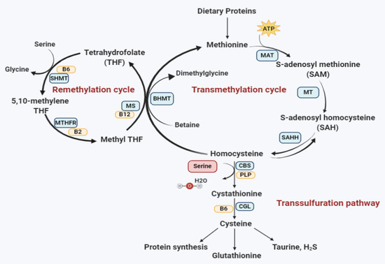 Methionine is an essential sulfur-containing amino acid that is involved in the development and proper mammalian growth. Once the dietary proteins are ingested and methionine enters the cells, methionine adenosyltransferase (MAT) will catalyze the condensation of methionine with ATP and form S-adenosylmethionine (SAM), also known as AdoMet. SAM serves as a crucial methyl donor for various methyltransferase reactions, including hormones biosynthesis and generating S-adenosylhomocysteine (SAH). SAH is then reversibly hydrolyzed into adenosine and homocysteine through the action of S-adenosylhomocysteinase hydrolase (SAHH). Homocysteine is a nonproteinogenic toxic intermediary amino acid residing at the intersections of several pathways. It can be remethylated through methionine synthase (MS) or liver-specific betaine-homocysteine methyltransferase (BHMT), which requires betaine as methyl donors. The other route of homocysteine is the transsulfuration pathway, where cystathionine beta-synthase (CBS) irreversibly converts homocysteine to cysteine. It catalyzes the condensation of homocysteine with serine and forms cystathionine, which is subsequently cleaved by cystathionine gammalyase (CGL) into cysteine and 2-oxobutyrate. Cysteine can be further converted to taurine and hydrogen sulfide (H2S).